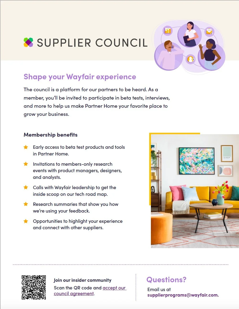 This sell sheet educates Wayfair suppliers on our council, which they can join to have an impact on their Wayfair experience.
